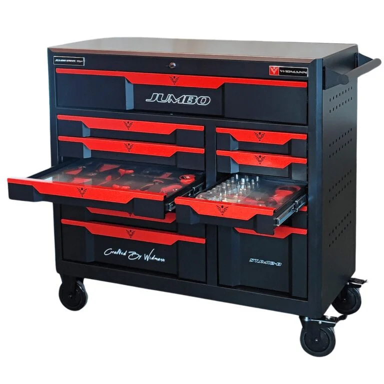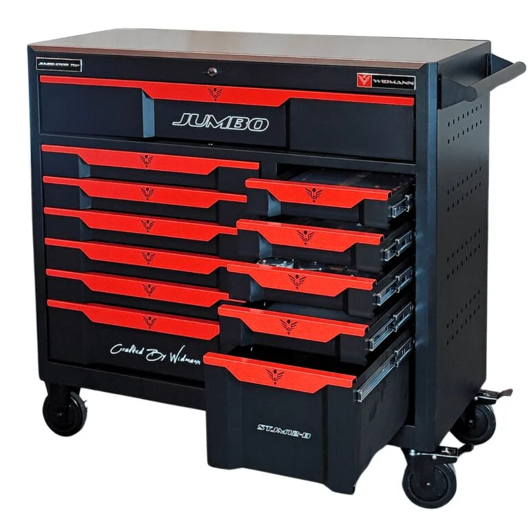The WIDMANN Jumbo Steel Top Trolley stands as a testament to high-quality craftsmanship and innovative storage solutions. With its sleek black design and an impressive 12 drawers, this trolley goes beyond mere utility, offering superb organization and accessibility for professionals in diverse industries. Whether you’re a mechanic, craftsman, or simply someone who appreciates order in your workspace, this trolley delivers reliability and performance.